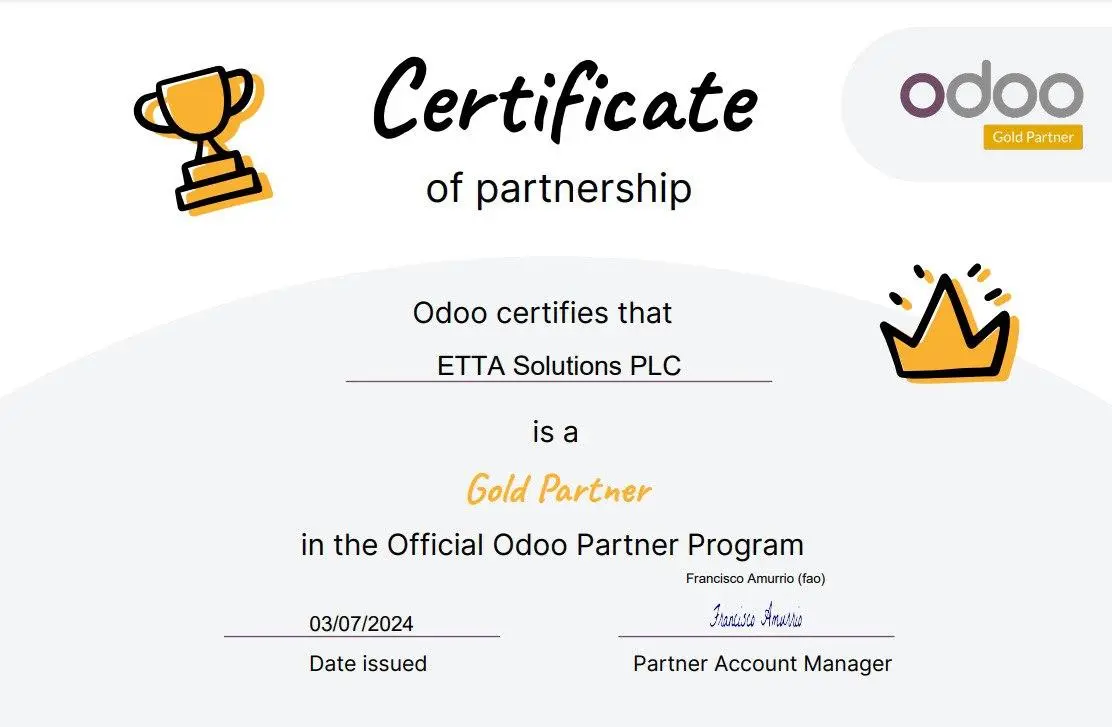 We are thrilled to announce that ETTA Solutions has achieved Odoo Gold Partner status! This prestigious designation highlights our team's expertise and commitment to delivering exceptional Odoo implementation and support services. As a Gold Partner, we offer unparalleled Odoo knowledge and capabilities to help businesses unlock the full potential of this leading open-source ERP platform. Thank you to our clients and team for making this possible!